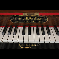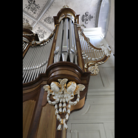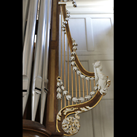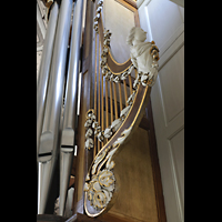 Geschnitzte Verzierung in Harfenform am Orgelgehäuse |