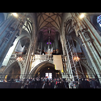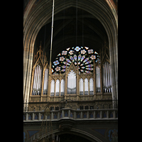 Blick von der oberen Seitenempore auf die Orgel und in die Kirche |