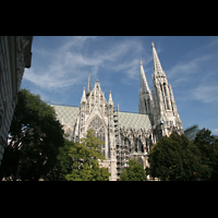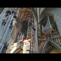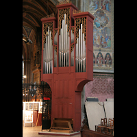 Seitlicher Blick über den Spieltisch auf die Orgel |