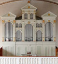 2 Manuale, 38 Ranks, 29 Register (+ 1 Tr.) 1910 erbaut von Anton Behmann 1984 neobarocke Umdisponierung durch ? (Ersatz von 6 Registern - davon wurden 3 ausgelagert und konnten bei der Restaurierung 2024 wieder eingebaut werden) 2025 erbaut von Kuhn (CH, Männedorf) unter Wiederverwendung von 3 Registern der Vorgängerorgel von 1901 (Wilhelm Schwarz, Überlingen) - mit * markiert Kegelladen mit pneumatischer Spiel- und Registertraktur |