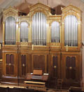 3 Manuale, 37 Ranks, 31 Register (+ 3 Ext. + 4 Tr.) 1908 erbaut mit 24 Registern im Gehäuse der Vorgängerorgel von 1861 von Walcker (D, Ludwigsburg) 1977 weitgehender Neubau unter Wiederverwendung weniger Walcker-Register durch Johann Krenn's Witwe und Söhne Durch minderwertiges Material und ebensolche Verarbeitung wurde die Orgel immer störanfälliger bis schwer reparierbar, daher der Entschluss zum Neubau 2017 technischer Neubau unter Wiederverwendung von 5 erhaltenen Walcker-Registern durch Eule (D, Bautzen) 2018 Einbau von Nasard und Terz im Schwellwerk durch Eule 2019 Einbau der Physharmonica im Schwellwerk durch Eule geplant Schleifladen mit mechanischer Spiel- und elektrischer Registertraktur mit 10.000 Setzern im freien Bereich (+ unbegrenzte Setzer auf Speicher), Crescendowalze, MIDI |