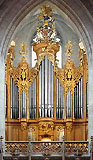 4 Manuale, 98 Ranks, 71 Register 1726 erbaut mit 38 Registern (37 real) von Leu 1751 umgebaut und auf 42 (später 44) Register erweitert von Victor Ferdinand Bossard 1751-1822 Arbeiten an der Orgel durch Karl Joseph Maria Bossard 1828 Erweiterung des Manualumfangs um 5 Töne und Hinzufügung von zwei 16'-Registern im Pedal durch Franz Joseph Remigius Bossard 1848 weitgehender Neubau mit 55 Registern auf 4 Manualen und Erweiterung um eine Echo-Orgel sowie 32'-Register im Pedal von Friedrich Haas (CH, Luzern) 1903-1904 Umstellung auf pneumatische Traktur und Erweiterung durch Goll (CH, Luzern) - Register von 1930 in der historischen Disposition mit * markiert 1930 Komplettumbau (Schleifladen, mechanische Spiel- und elektrische Registertraktur) auf 78 Register unter Wiederverwendung von mindestens 16 Registern der alten Orgel durch Kuhn (CH, Männedorf) 1941-1963 geringfügige Umdisponierungen durch Kuhn (?) 1999 weitgehender Neubau mit 78 Registern unter Verwendung einiger alter Register durch Kuhn Das Münster verfügt außerdem über eine separate Schwalbennestorgel im Chor mit 19 Ranks / 14 Registern auf 2 Manualen und Pedal (Metzler, 1982) sowie über eine Forschungsorgel im Chor mit 5 Registern auf 3 Manualen und Pedal, die anschlagsdynamisch den Wind regulieren kann |