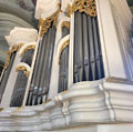 2 Manuale, 23 Ranks, 18 Register 1745 erbaut von Thomas Schwarz 1993 restauriert durch ? Ehem. Schleifladen mit mechanischer Traktur, jetzt elektropneumatisch - Orgel ist schon seit langer Zeit unspielbar und restaurierungsbedürftig; seit Jahrzehnten wird die kleinere Orgel auf der Nebenempore genutzt Die Kirche verfügt außerdem über eine separate (derzeit unspielbare) Hauptorgel mit 60 Ranks / 43 Registern auf 3 Manualen (Schwarz 1747) und eine Kuppelorgel mit 6 Registern auf 1 Manual (Gartner 1831) |