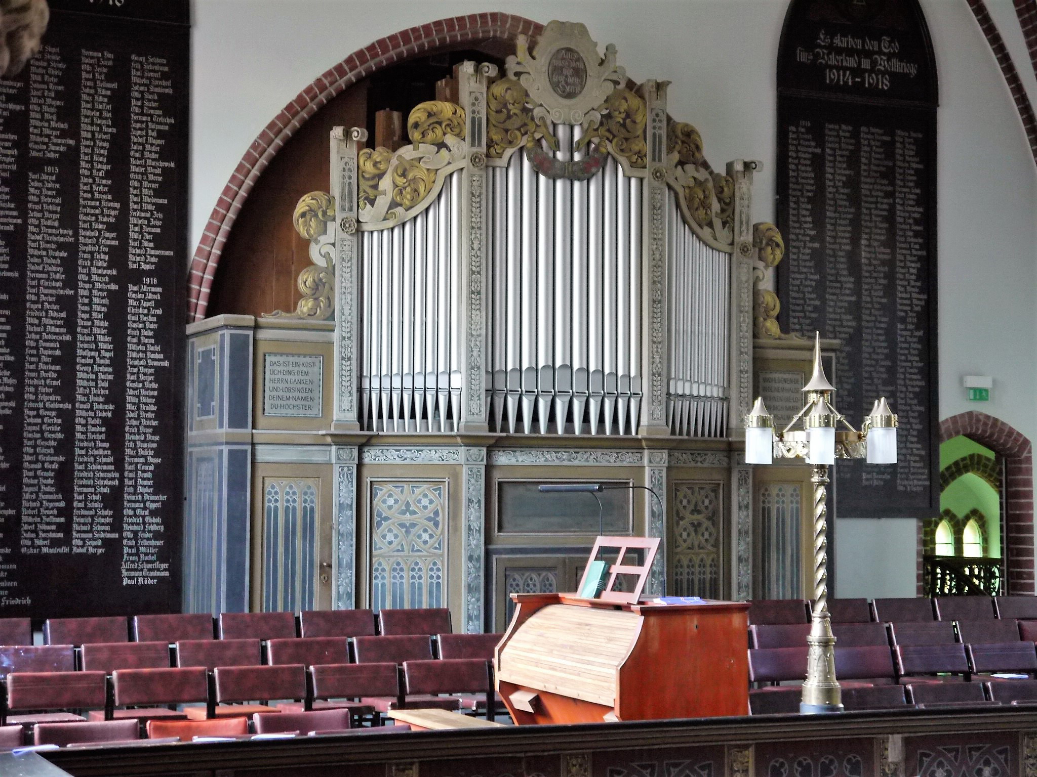 1908 erbaut mit 20 Registern auf 2 Manualen und Pedal auf pneumatischen Kegelladen von W. Sauer (D, Frankfurt/Oder)