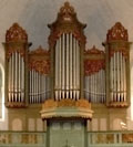 2 Manuale, 32 Ranks, 27 Register (+ 3 Tr.) 1908 erbaut von E.F. Walcker & Cie. (D, Ludwigsburg) 2022-2023 restauriert von Weimbs (D, Hellenthal) Membranen-Windladen, elektropnuematische Spiel- und Registertraktur mit 2 freien Kombinationen, 3 festen Kombinationen (mf, f, Tutti), Pianopedal, Crescendo und Generalkoppel |