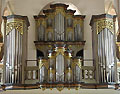 3 Manuale, 54 Ranks, 32 Register, 2.596 Pfeifen 1936 Bau einer neuen Orgel unter Wiederverwendung einiger alter Register (keine davon erhalten) auf Kegelladen mit 29 Registern durch Anton Feith (D, Paderborn), wobei der alte HW-Prospekt erhalten bleibt Bis zum Ausbau 1969 bleibt das gesamte Klanggut ungünstigerweise hinter dem historischen Prospekt in der hinteren Turmnische verborgen. 1972-73 Neubau der Orgel unter Wiederverwendung des HW-Prospekts und zahlreicher vorhandener Register (mit * gekennzeichnet) durch Siegfried Sauer (D, Höxter) Erst hierbei erhält die Orgel mit den neuen Gehäuseteilen für RP, BW und Pedal incl. ihrer einheitlichen Farbfassung ihr heutiges barockes Erscheinungsbild. 1998-99 Restaurierung der Orgel durch Siegfried Sauer nach einer Kirchenrenovierung. Vorgängerorgeln: 1710-11 als einmanualige Orgel mit 8 Registern erbaut für die alte Nicolaikirche von Johann Berenhard Klausing (D, Herford) 1770 nach Abriss der alten und Neubau der St. Nicolaikirche in diese umgesetzt 1845 Umbau durch Carl Kuhlmann (D, Gottsbüren) 1878 Umbau durch August Randebrock (D, Paderborn) |