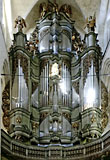 3 Manuale, 71 Ranks, 51 Register 2017-2020 historisierender Neubau im alten Gehäuse durch Kristian Wegscheider (D, Dresden) unter Wiederverwendung einiger noch gut erhaltener alter Teile und Pfeifen + Cimbelstern + Pauke (2 schwebend gestimmte Ggroße Holzpfeifen) ohne Werkzuordnung; Stimmung: Neidhard II, a' = 440 Hz Vorgängerorgeln: 1582 erste Orgel von Nicolai (= vermutlich Nicolaus Maas) 1633 Reparatur, Umintonation und Ersatz einiger Register durch Paul Ldemann (D, Paswalk) 1659 Reparatur durch Friedrich Stellwagen 1732-1741 Orgelneubau Durch Christian Gottlieb Richter (damals D, Stettin) bereits 1751 und 1763 jeweils Generalüberholungen wegen baulicher Mängel durch ? 1778 Reparatur und Umbau durch Ernst Julius Marx (D, Berlin) 1829 Reparatur durch Carl August Buchholz Ende der 1860-er Jahre war der Zustand der Orgel bereits wieder so schlecht, dass über einen Neubau verhandelt wurde 1877 erbaut mit 68 Registern auf 4 Manualen im alten barocken Gehäuse (1741) der Vorgängerorgel von Friedrich Albert Mehmel (D, Stralsund) unter Wiederverwendung einiger alter Register Das Gehäuse hilet dem Gewicht des Riesenwerks nicht stand und sackte teilweise ab, wodurch die Spielbarkeit stark eingeschränkt wurde 1945 Ausplünderung, dabei Verlust vieler Metallpfeifen; in den Folgejahren weitere Beschädigungen |