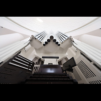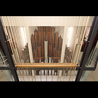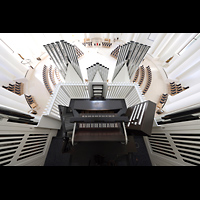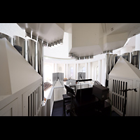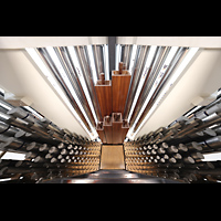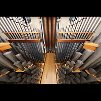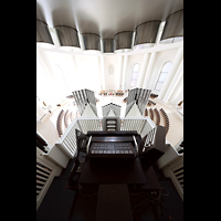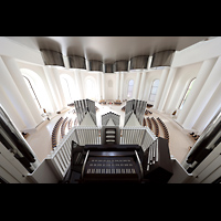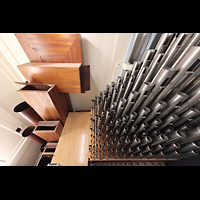 Seitlicher Blick über Spieltisch und Rückpositiv nach unten in die Kirche |