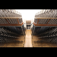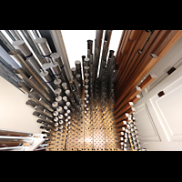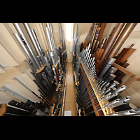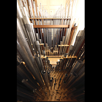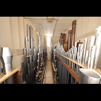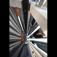 Blick durch die Zugruten ins Rückpositiv auf die Pedalpfeifen ganz hinten |