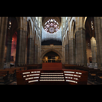 Blick auf Hauptwerk, Solowerke und die Buntglasrosette an der Westwand |