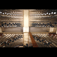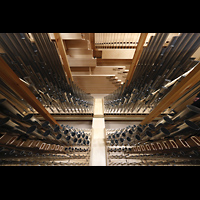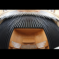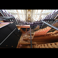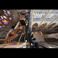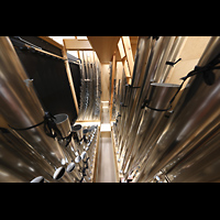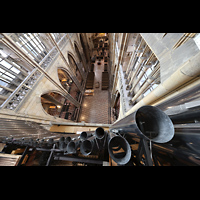 Blick von oben auf Hauptwerk, die Solowerke und Prospektpfeifen ins Langhaus |