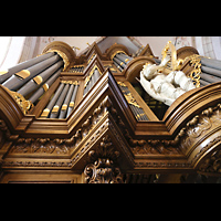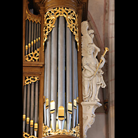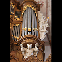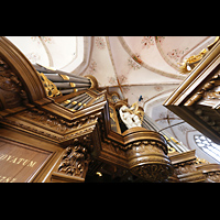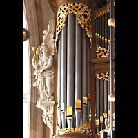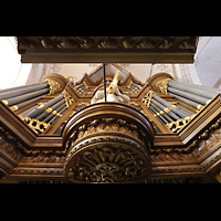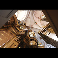 Seitlicher Blick von der Orgelempore nach oben auf den Prospekt |