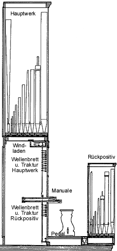 Hinweise: Die Zeichnungen auf dieser Seite sind Scans aus dem Buch "Die Orgel" von Friedrich Jacob (Schott Verlag), die textlichen Ergänzungen in den Skizzen stammen von mir. Die Skizzen können durch Anklicken vergößert werden. Die Klangbeispiele stammen von der CD "Das Geheimnis Orgel", gespielt von Paul Wißkirchen an der Altenberger Domorgel mit freundlicher Genehmigung der TMK-Gruppe Medienproduktion & Vertrieb, Köln. |