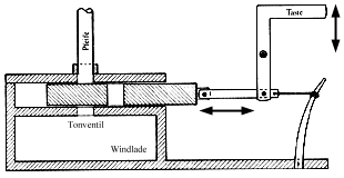 entwickelt. Hierbei setzt der Tastendruck eine Pneumatik (Druckluftmechanismus) in Gang, die durch Röhren / Schläuche mit dem entsprechenden Tonventil unter der Pfeife verbunden ist und