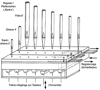 Das Registrierwerk Die Übertragung von den Tasten der Manuale und des Pedals zu den einzelnen Pfeifen ist nur die eine Seite der Traktur - die andere ist das Ein- und Ausschalten der einzelnen Register (Pfeifenreihen, Klangfarben). Die gesamte Anordnung ist eine zweidimensionale Matrix: In der einen Richtung stehen die einzelnen Pfeifen (Töne) und zugehörig die Spiel- / Tontraktur, in der anderen Richtung stehen die Pfeifenreihen (Register) und zugehörig die Registertraktur. |