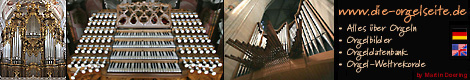 Cookies: Cookies sind kleine Dateien mit Informationen, die viele Internetseiten auf dem PC des Benutzers speichern und wieder abrufen. Die Orgelseite (und alle darunter liegenden Seiten) verwenden keinerlei Cookies. Dies gilt u.U. nicht für die verlinkten externen d.h. außerhalb der Orgelseite liegenden Internetseiten. |